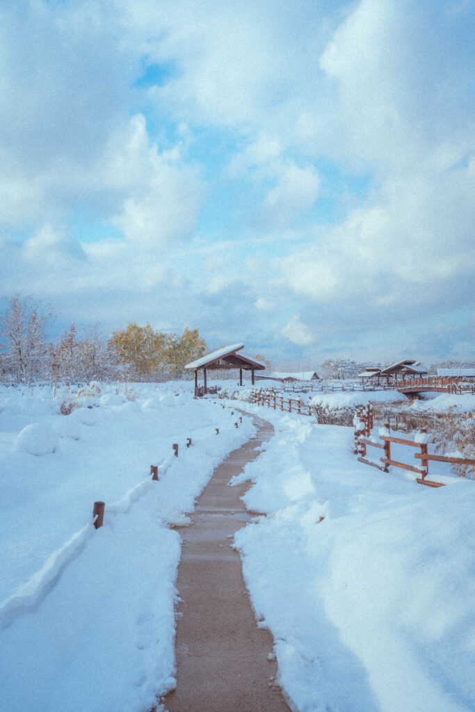 보여준다. 갈대밭 사이로 이어진 산책로는 하얀 융단처럼 펼쳐지고, 나무 데크 위로 내려앉은 눈은 발걸음을 자연스럽게 느리게 만들고 서울 근교에서 이 정도의 겨울 풍경을 만날 수 있다는 사실만으로도 충분히 목적지가 된다.
