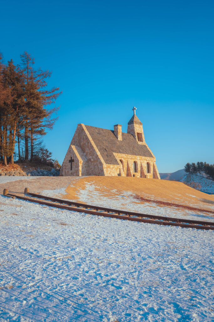 교회 앞을 가로지르는 철로는 이 공간의 또 다른 특징이다. 곡선을 그리며 이어지는 철로는 시선을 멀리 풍경 속으로 유도하며, 주변 설경과 어우러져 독특한 장면을 만든다. 이 길은 교회로 향하는 동선이자, 방문객들이 가장 오래 머무는 사진 촬영 지점이기도 하다.
